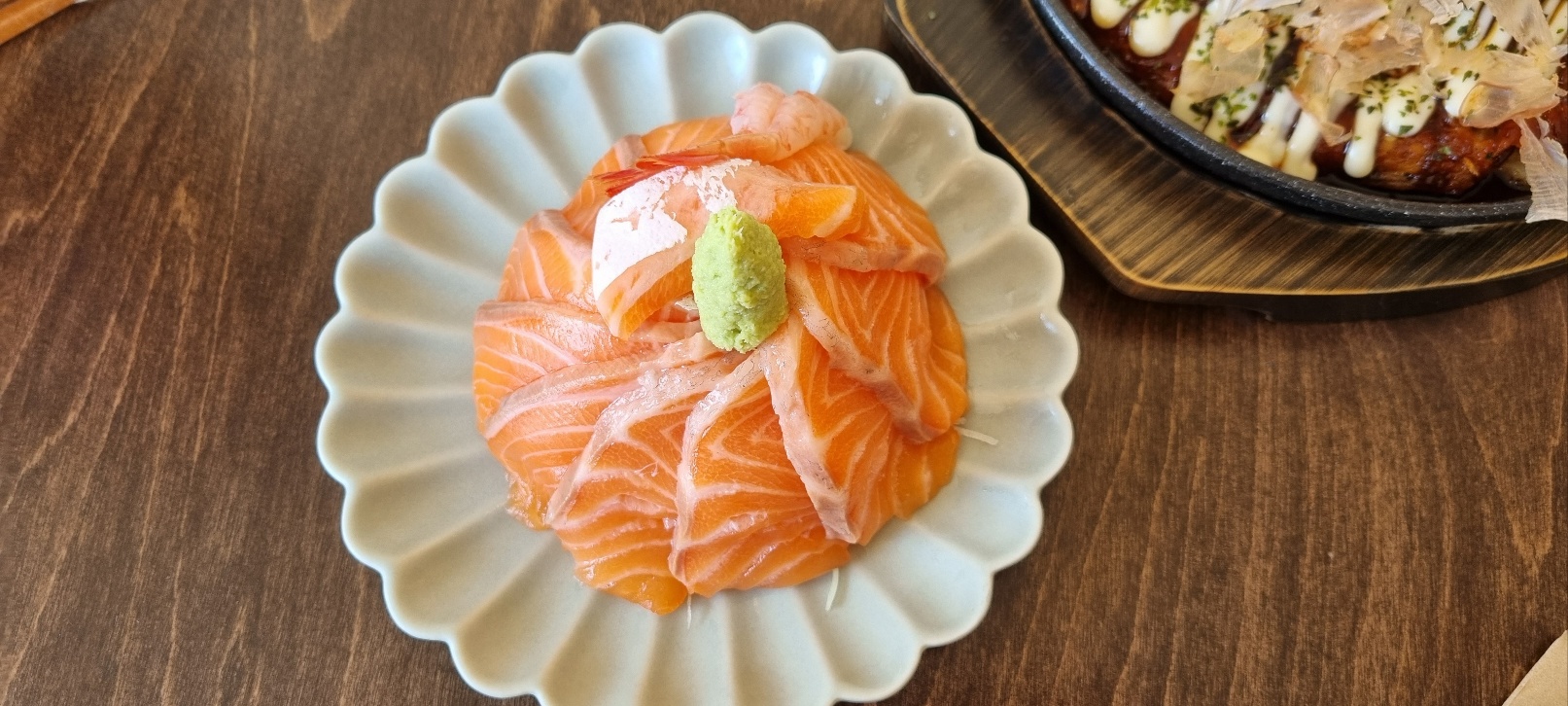 연어사시미 : 싱싱한 연어의 육질을 느끼실 수 있어요. 이쁜건 덤!!