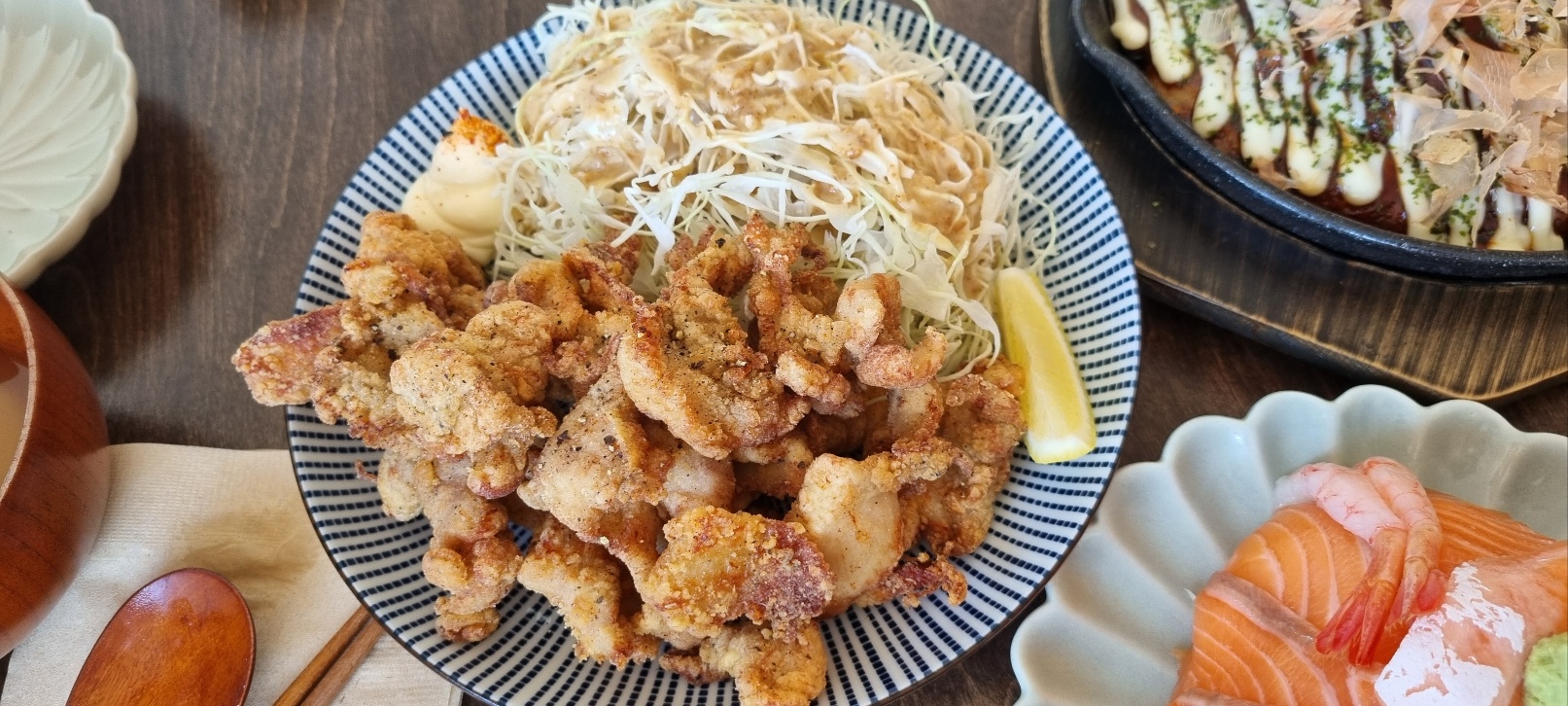 가라아게 : 탕수육 비슷한 느낌의 닭 튀김이에요. 느끼하지 않고 부드럽고 한입에 딱 들어갈 사이즈로 나와요. 옆에 있는 레몬을 즙을 짜서 뿌려주면 상큼한 맛이랍니다.