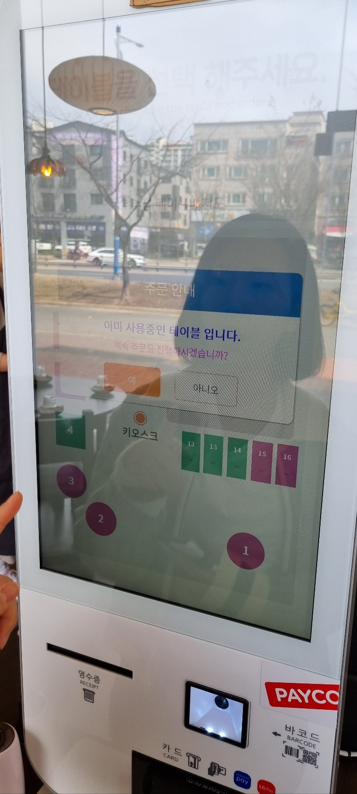 주문은 키오스크로 해야해요. 저희는 처음 와보는 곳이라서 일단 테이블에 앉아서 메뉴판을 주시기를 기다렸는데 점원 분이 키오스크에서 주문해야한다고 하셨어요.