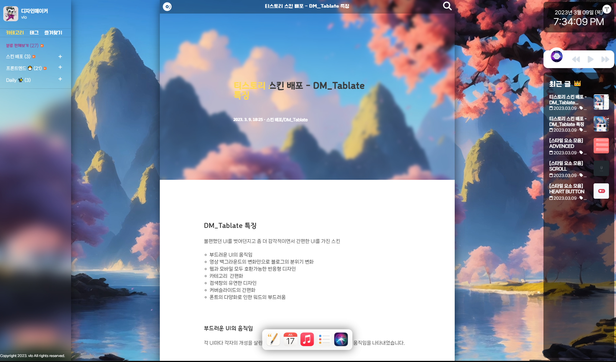 DM_Tablate 특징 불편했던 UI를 벗어던지고 좀 더 감각적이면서 간편한 UI를 가진 스킨 부드러운 UI의 움직임 영상 백그라운드의 변화만으로 블로그의 분위기 변화 웹과 모바일 모두 호환가능한 반