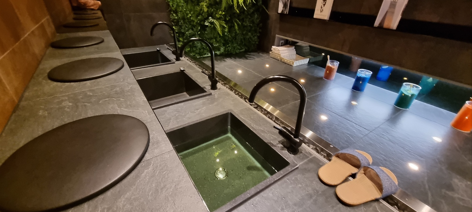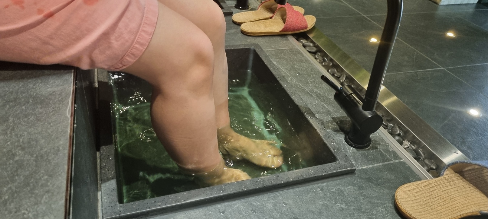 탈의실에서 옷을 갈아입고 나오면 족욕물이 준비되어 있어요. 말씀을 안드려서 그런가 족욕에 푸는 에센스는 임의로 해주시는거 같아요. 저는 노란색 여자친구는 에메랄드색 물에서 족욕을 했습니다.