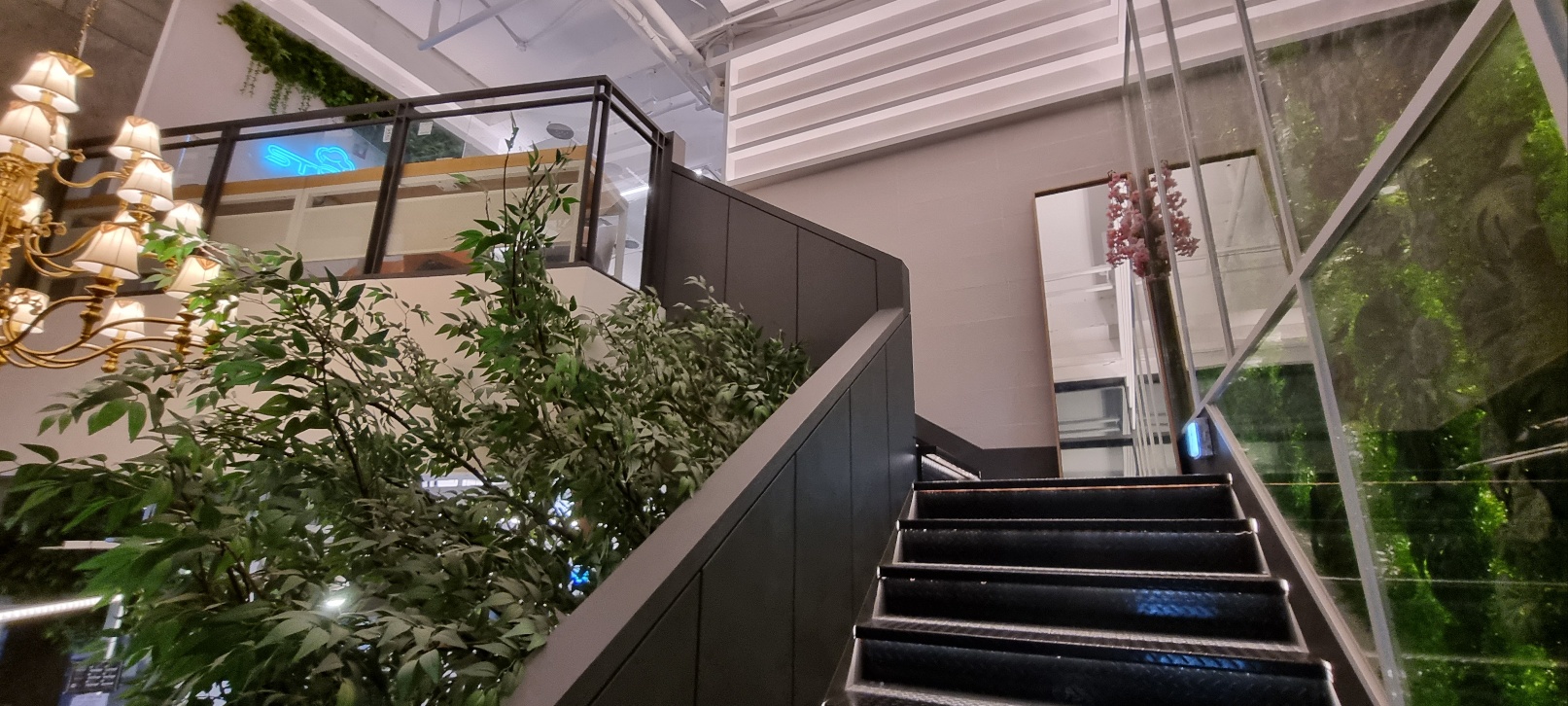 계단이 느낌있게 되어있어요. 녹색의 벽과 밝은 샹들리제는 아주 잘 어울려요. 스토랑트 봉명점은 여기 계단이 포토존이랍니다.
