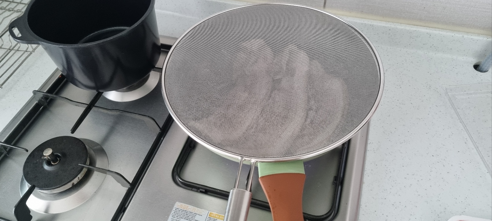 후라이펜 위에 놓은 그물망이 포인트! 고기나 음식 할 때 음식물이 밖으로 튀지 말라고 산 제품인데 정말 좋습니다. 고기를 굽고 가스레인지 주변을 확인해 봤는데 기름이 안튀었어요.