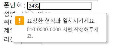 - title : 패턴에 맞지 않은 상태로 submit 시 표시됩니다. 010-0000-0000